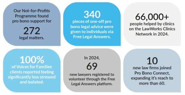 In 2024, LawWorks supported 272 legal matters for charities and not-for-profits, helped over 66,000 people through our Clinics Network, placed 75 cases through Pro Bono Connect, and saw more than 10,000 volunteers contribute their time and expertise. These achievements reflect the dedication of our members, volunteers and partners, whose commitment ensures that access to justice continues to be strengthened even in challenging times.